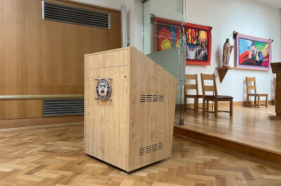 A wooden AV lectern was provided with a hard-wearing melamine veneer finish and the school’s logo fitted to the front. The lectern includes a pull-out keyboard tray and a lockable rack for AV equipment. Also included is a slim and discreet lectern mic mounted in an acoustic shock mount that offers excellent pickup of the presenter whilst minimising any unwanted noise from contact with the lectern.